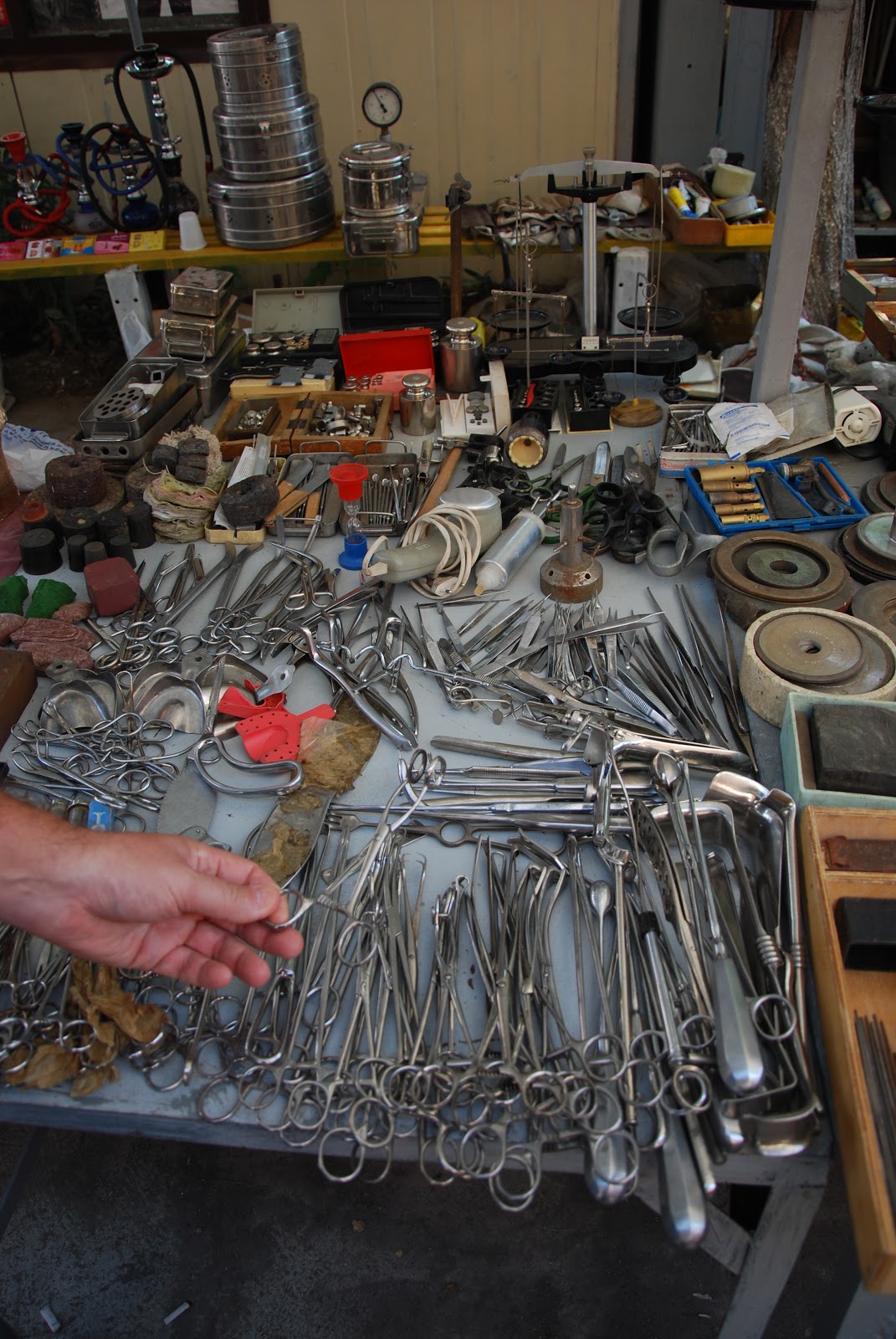 The mix is eclectic. In a 10-minute walk, I saw antique silver spoons, surplus military assault gear (fatigues, tactical holsters, boots, knitted green face masks), hand-embroidered tablecloths, souvenir swords, rusted swords from the late Ottoman empire (early 1900s), wooden wine jugs, European soccer jerseys, heavy machine tools, wagon wheels and a whole table covered in used stainless steel surgical equipment that looked like something left over from the set of "Saw."